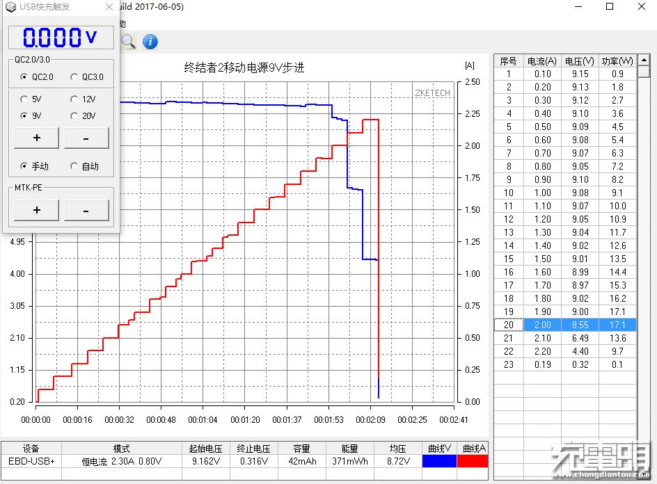 iWALK终结者2移动电源9V步进测试,最大输出电压9.0V电流1.9A功率17.1W,阶段性线补超出产品铭牌信息。