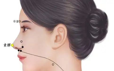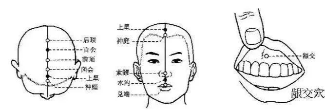 书上写百会,虢国太子尸厥。扁鹊取三阳五会,这是讲治百会。有个典故,因扁鹊是针 灸的祖师爷。我们用的手法、治疗法则都是来自扁鹊。他是祖师爷,所以,我特别介绍一下。在扁鹊那个时代,扁鹊就是医生,比如你姓徐,现在叫徐医师,以前叫徐扁鹊。扁鹊原 名叫秦越人,当时虢国太子尸厥昏迷,医师都想不到怎么治啊。大家就说一定要找秦越人来。 扁鹊是神龙见首不见尾的,但秦越人会算命算出太子有难,他就自己跑出来帮虢国太子下百 会放血,把太子救回来。虢国国王很开心,就公布一个法令,今后全天下的医生都不能称扁 鹊,只有秦越人可以称扁鹊,其它人改名叫郎中。那前顶,如果从百会往前找一寸半就是前顶,不需要顖会(也称卤会穴)从后一寸半。那平常下针的时 候,百会前一寸半,后一寸半,左一寸半、右一寸半,都是加强百会的效果。下头针时,都是要病人躺着,这是耳朵,你找到百会在这边,在这个百会前五分的地方, 你摸到百会有个凹洞,往这凹洞的前五分,在这个地方斜刺,刺到百会穴。我们在头下针, 是下在头骨和头骨之间,没有人直扎进去的。一般我们用放血,让血流出来,平常下针的话 是采斜刺的角度下去,不是直的下去。顖会呢?小孩子生下来头上的凹洞,小孩长大才会慢慢长起来。那如果我们要找这个顖会呢,我们从上星开始找,从神庭上星。这是额头,画正面,人家说过发际五分,但有人发 际很高,有人发际很短,所以不能说从发际开始找。有个方法找,你从直线往上,一路顺着督脉,一路摸上去,当你的弧度转上去会有感觉。 过去我们的发际实际上就是在这个交接。凸起来的角这边就是发际。你弧度转上去的第一个 凹点就是神庭。那还有人的找法呢,从眉毛找上去。可是眉毛有高有低啊。有人眉毛长这个样子,另一个眉毛长这个样子。一般额头比较小的比较笨,眉毛长在发 际跟眉毛中间,是大官,你看很多大官眉毛长在后面。那眉毛要长一点,太短就成师爷,师 爷就只有一点眉。所以找穴道最好是触感,触感不好没关系,你从百会回头找。百会很好找,百会往前走 一寸半就是前顶,前顶再往前一寸半就是顖会,顖会再往前一寸半就是上星,上星跟神庭只 差五分,平常这些穴道我们很少用。我们大概会用到上星。上星呢?我们在治鼻窦炎 、治鼻 子发炎时,在上星灸。上星是用米粒灸,把头发分开来,头发用夹子夹住,找到上星穴的时 候,一般督脉的穴道都有个凹洞,在上星这个凹洞上放一点凡士林,艾绒用细细小小的放上 去,香一点,一下就烧完,做七壮,九壮,十一壮。灸的时候,会麻麻的一条直接到鼻子, 效果不错。那灸到头上有个疤也没关系,和尚有九个疤,你才一个。搽一点外用伤口的药膏 就可以。神庭穴一般来说不针,你大概知道位置就好了。灸比较多,一般很少用针的,脑部或头 部的穴道,大部分都是治精神病,你想近取穴就对了。比如说这个人精神病,你都可以取他 的近取穴,不用去强记。所以,我们在针灸考试,不会叫你把上星的穴道功能写出来,因为 穴道治症很多是相同嘛,你只要知道就可以了。 再来是素髎,素髎在鼻头的正中间,鼻头的地方就是素髎。这个素髎穴跟女人的会阴穴 是相对的,女人如果是处女之身,素髎这会有一片骨头,鼻子一摸,就感觉得出来,如果不 是就变成两片骨头。很少扎针在素髎的,通常用点刺放血治酒糟鼻 ,鼻子很红,效果非常 好,不扎针也不灸用放血的,这是近取穴,作用就是鼻窦炎 ,鼻息肉 。我用最多就是酒糟 鼻,酒糟鼻很难看啊,放血效果最好。