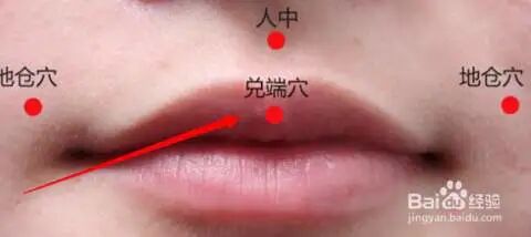 再来是水沟,水沟就是我们的人中,前面讲过怎么找了,现在讲穴道怎么下,书上:“主 消渴饮水无度”,因为在嘴巴旁边嘛,你喝一杯就小一杯出来。癫痫、不识尊卑、胡说八道、 面肿 。有的人人中是一个缝,像个水沟。有人没有水沟,平的代表没有小孩,没有儿子,有 水沟代表有儿子。常常有的妇人,早上起来脸肿肿的,都可以下,效果都很好。兑端呢,在嘴唇的地方。这是上嘴唇,这是兑端,上唇上面正中间。这是近取穴,平时很少用。
