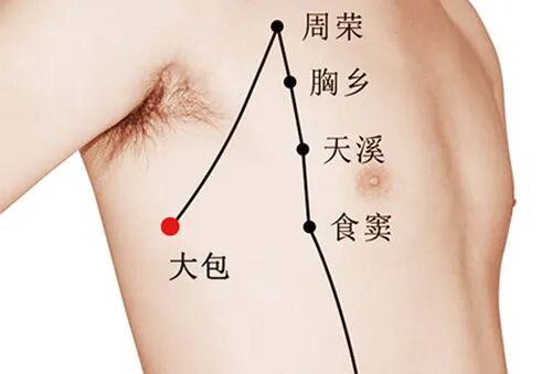 这个正在胳肢窝下方的穴道,我们叫极泉,极泉下三寸叫渊液。再下三寸,也就是极泉 下六寸,就是大包穴。大包穴总统全身大络,全身的络都是大包在管。经与经之间都有络,所以才会有表里的 现象出现,经和脏也有络,脏腑交接也有络,所以络是布满全身的,主干道是经,次要是络。所有的络是大包在管,这个穴道过去是武术家攻击敌人的穴道。攻击这个点,会造成对 方全身瘫痪,对方会倒下去。所以上帝造人造得很好,手臂一握起来,大包就被挡到,就打 不到,手天生就是保护这个地方的。所以要攻击,要把手拿开再打下去,当然要在他不注意 的时候。大包穴是脾之大络,络是联络的意思。脏腑之间不能沟通时,要大包让他协调。所以大 包是常用的穴道,阴经、阳经的络都是他在管。为什么我们讲脾之大络。因为脾脏就好像水坝,水坝从供水到种田,都很重要,这个管 道就是大包,都是大包在管。所以脾脏能管五脏,是大包穴的关系。所以小肠消化吸收后,把营养转到脾,会有各种营养。西医就讲有各种维他命。中医不 是,中医是讲五种颜色,有青色、红色、白色、黄色、黑色。那如果身体健康的人,脾有个大络就是大包,它能把黑色的送到肾脏,白色的送到肺脏, 红色的送到心脏,青色的送到肝脏,黄色就留在脾。而脾主肌肉,就会跑到肌肉里面去。五 种颜色应该各归其位,黑色的入肾,白色的入肺,诸如此类。若有一天,病人跑来看你,这人脸色为何发黄,就是黄疸 ,对你们来说是黄疸,对中医来说不是这样。对中医来说,是你肝胆有问题了,脾胃有问题了,木克到土,木太大,顶到土了。土顶到了,就没胃口,胃气就少了。少了以后,这营养液是黄的,小肠要把营养给 它,但脾胃不能收。所以会散发出来,脸上都是黄色。