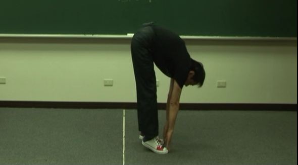 那如果说你从上面弯下去碰不到你一定要这手先碰到地上然后脚慢慢过去过好以后呢,那踮起来,就碰到了。诸位可以练练看。你如果直接放下去做不到这个动作很奇怪的啊。