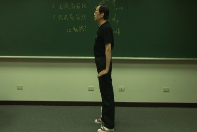 那基本上易筋经的动作武式易筋经的动作,最后一个结束的时候啊最难,最后一个动作,那按照过去的功法都是所谓难就是一因为他手跟脚要碰到而且是顶到不动,现在我们手跟脚碰到顶到不动脚还要踮起来,你如果说踏平了还好你如果是踮起来手去摸他就非常的困难。