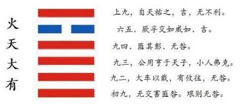 这个大有在物象上面,跑到人间来的时候,第一个,富有人。有个很有钱,他大大的一笔财富在身边,富有本无罪,但是你有富有而骄侈之心显露于外,一定有祸。所以这个富有如果处理不好,反而招来祸害,这是富有的人。