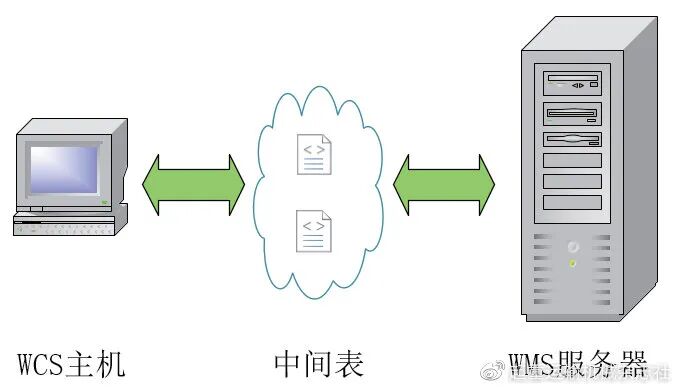 WCS 与WMS 交互信息有多种方式,包括 DBLink、WebService、Socket 等。其中,DBLink 采用数据库表作为双方交互数据的容器,这种交互方式只需要将数据信息按照双方约定的格式写入到中间表对应的字段中即可,DBLink 方式已经应用很多年,其开发简单,并且方便后期对于信息溯源,考虑到WCS 和WMS 间交互的数据量不大,所以在工业企业中广泛使用。通常设计两张中间表,一张用来接收WMS 信息,一张是WCS 用来将数据反馈给WMS,实现数据的双向流动,见图2。