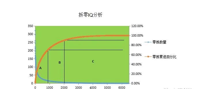 3)IQ分析:每个单品的订货数量分析。这种分析主要用于库存ABC分析。库存ABC对于仓库库存结构设计和拣选系统的设计都有非常重要的作用。