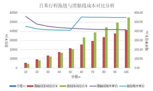 关于拖链和滑触线在不同行程下的成本分析如下: