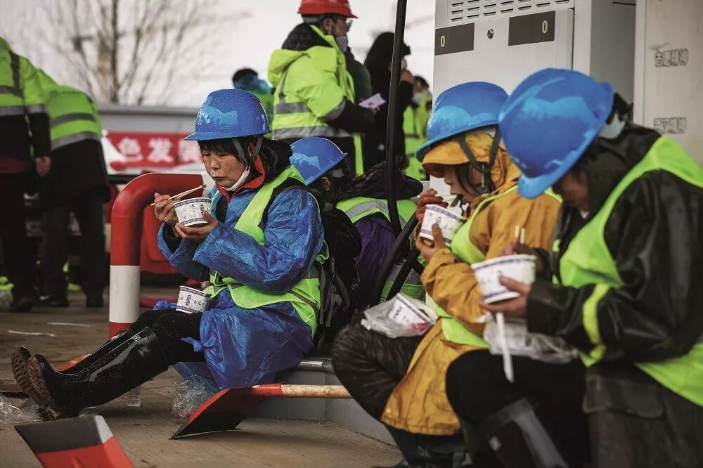 (2020年1月24日,农历除夕,在武汉火神山医院施工现场吃年饭的工人。摄影/ 陈卓)