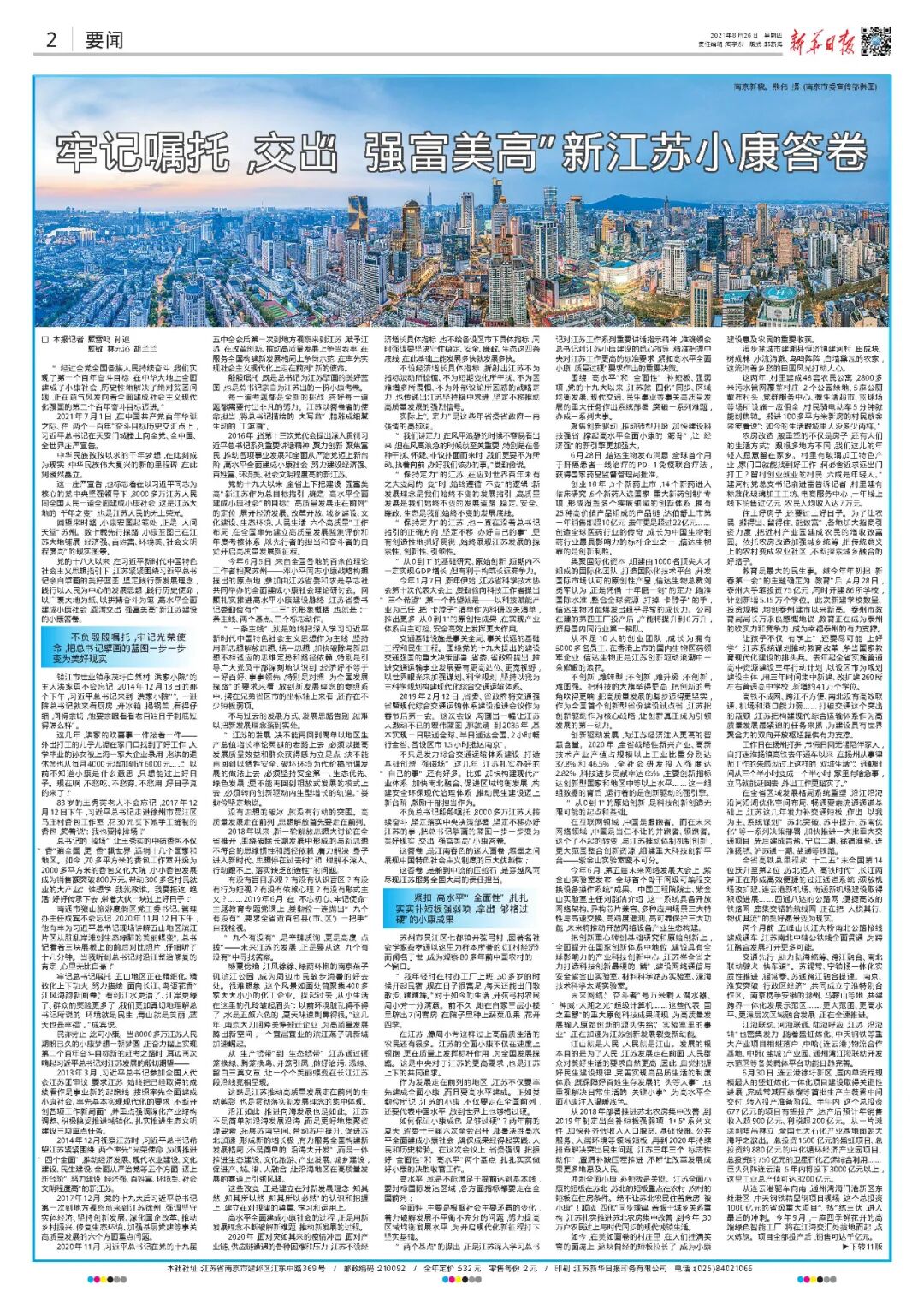 不负总书记殷殷嘱托,8000多万江苏人接续奋斗,坚定落实中央决策部署,坚定不移办好江苏的事,把总书记擘画的蓝图一步一步变为美好现实,交出“强富美高”小康答卷。