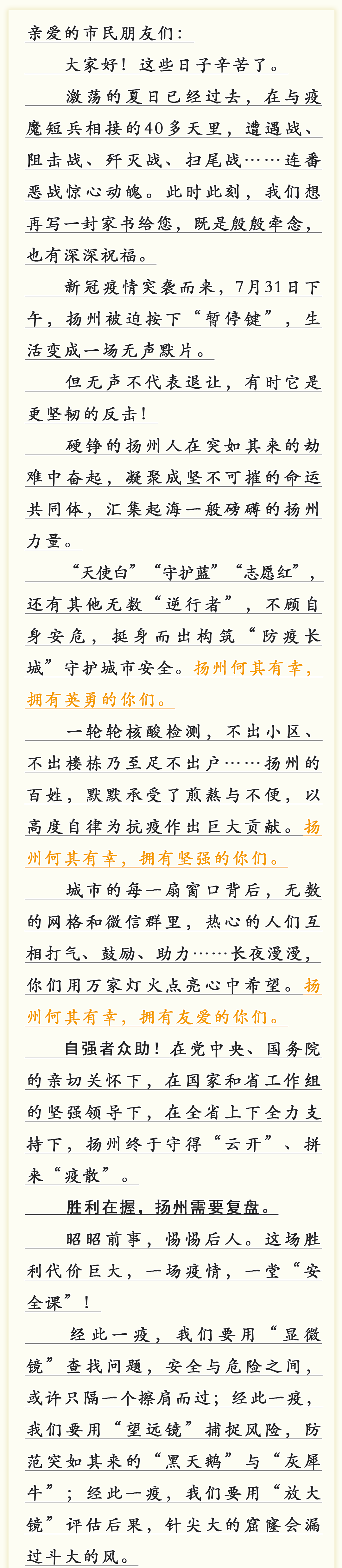 今天起,扬州实现全域低风险。回望抗击疫情的40多天,硬铮的扬州人坚忍不拔、不惧风雨,众志成城、无私无畏,齐心协力投身疫情防控阻击战。今天清晨,他们收到了一封家书……