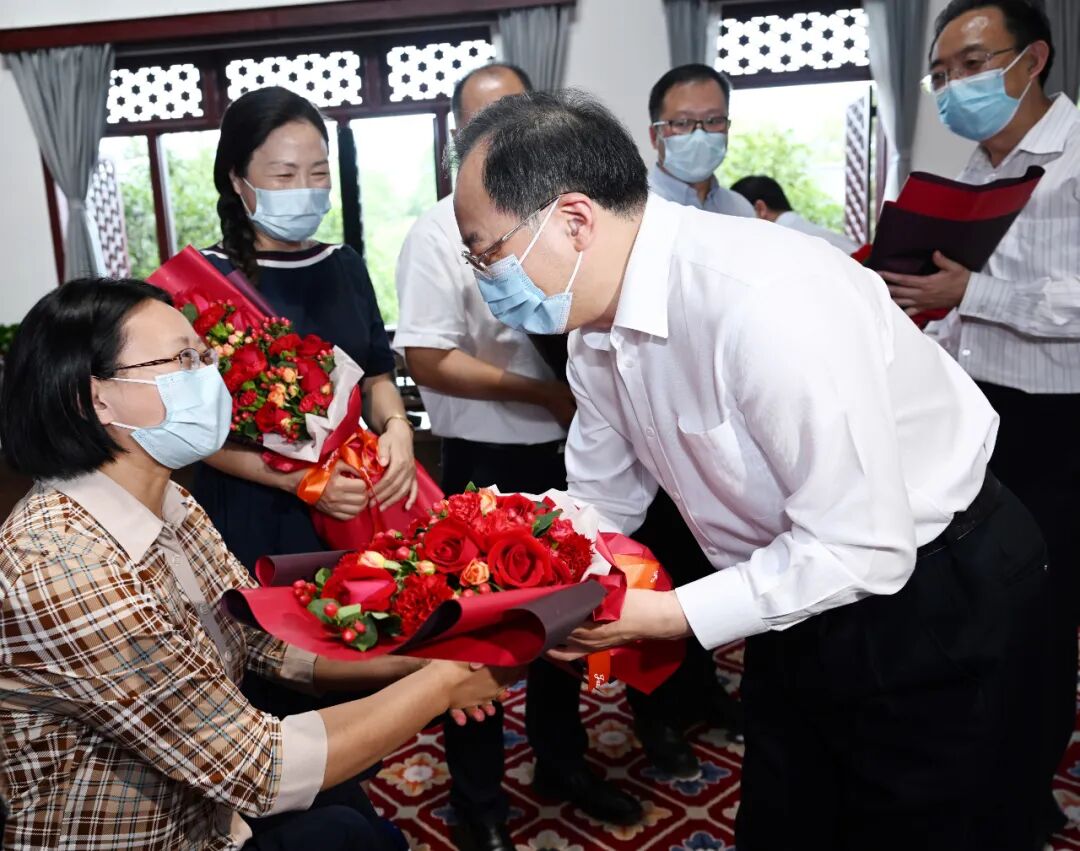 吴政隆与教师代表们交流,并送上鲜花和节日美好祝福。他说,学高为师,身正为范。一代又一代南师大的教育人传承师道、薪火相传,为党的教育事业付出了巨大心血。师范院校是培养教师的主阵地。希望大家落实好立德树人根本任务,捧着一颗心来、不带半根草去,做学生为学、为事、为人的“大先生”,做党和人民满意的“四有”好老师。学校要高度重视教师队伍建设,突出全员全方位全过程师德养成,用“优秀的人”培养“更优秀的人”。调研中,吴政隆指出,长期以来,南京师范大学为国家、为江苏各项事业发展输送了优秀人才、作出了重要贡献。今年是南师大建校120周年,我代表省委、省政府向全校师生员工、广大校友表示祝贺和问候。希望学校深入学习贯彻习近平总书记关于教育的重要论述,深刻领悟“两个确立”的决定性意义,坚持党的领导,坚持用习近平新时代中国特色社会主义思想凝心铸魂,坚持为党和人民事业服务,为党育人、为国育才,努力在新起点上再创新辉煌。
