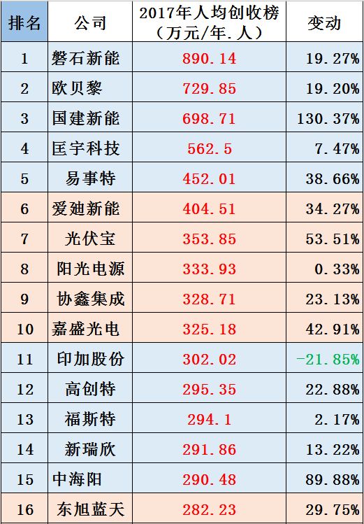 黑鹰数据显示:68家公司“人均创收”实现正增长;另31家公司2017年人均创收出现不同程度负增长,这其中包括中环股份、隆基股份、亿晶光电等大型光伏企业。