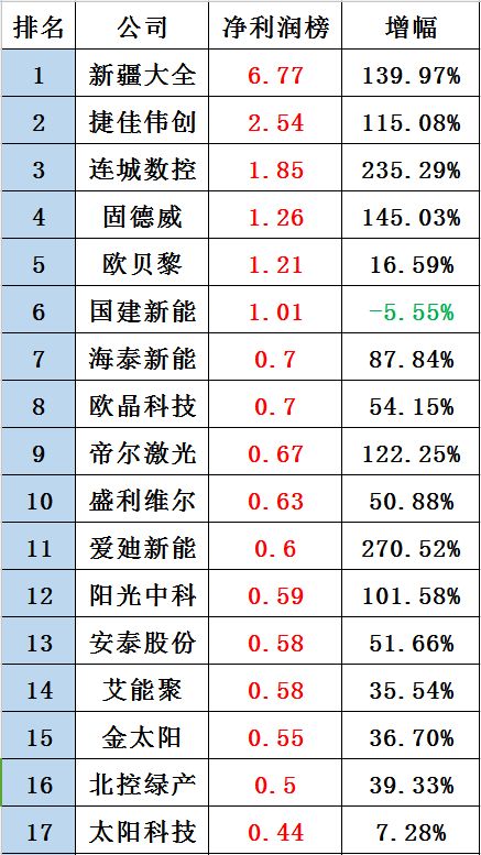 新疆大全再次摘得利润榜榜首桂冠,二三名分别为捷佳伟创、连城数控,三者增幅都在110%以上,而增幅在100%以上的公司共有8家,它们组成了一道极为靓丽的风景线。