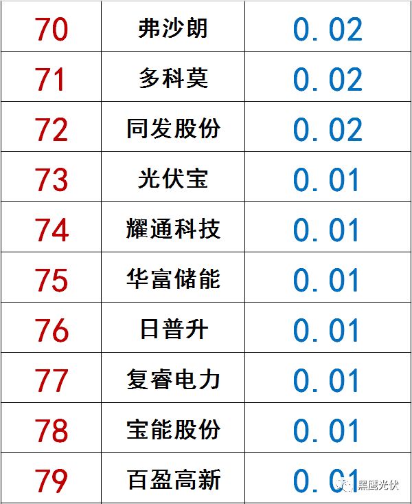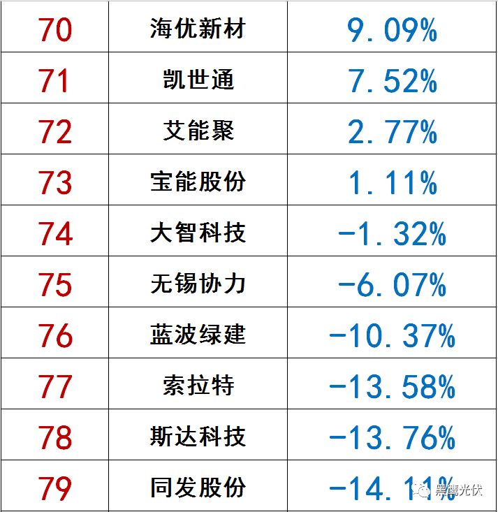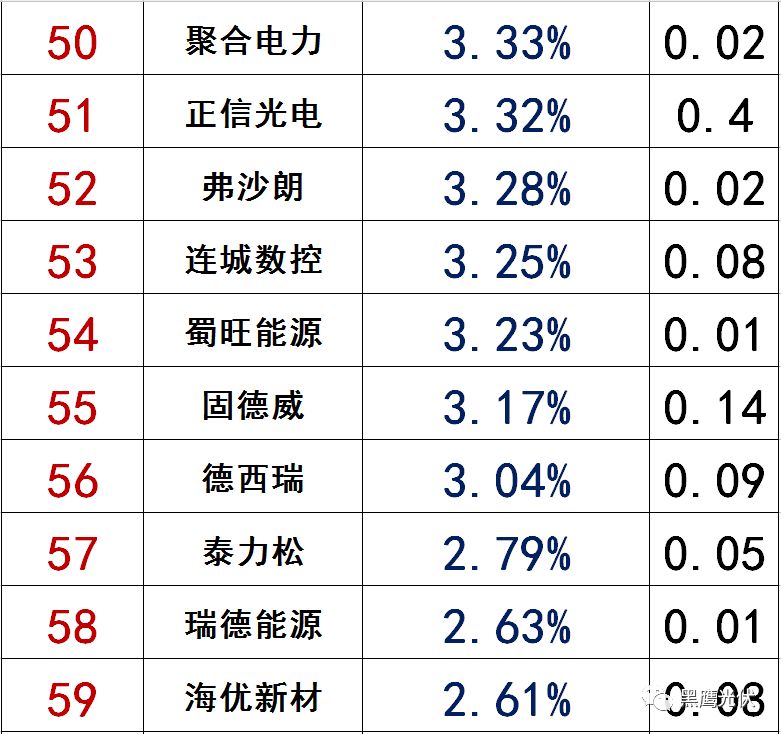 在黑鹰榜中,净利润榜前三名分别为新疆大全、捷佳伟创、固德威,三者主营业务分别为多晶硅、光伏设备、逆变器。