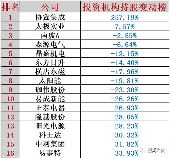 光伏上市公司一季度机构持股变动榜单