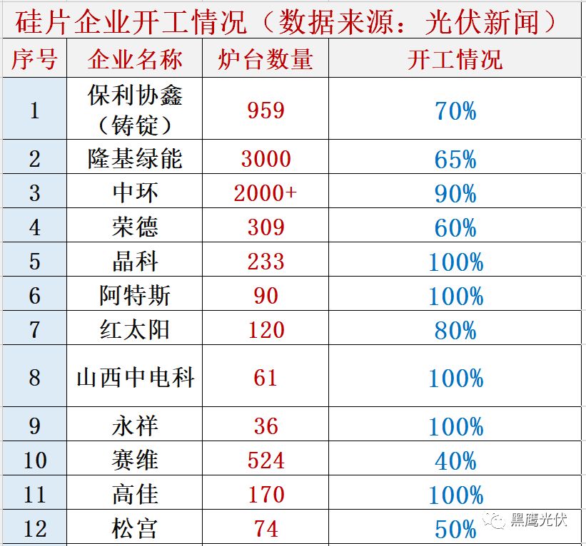 “光伏新闻”近期调研国内单多晶硅片企业的生产情况。调查结果显示,国内铸锭企业67家左右,铸锭炉6112台左右(含G5、G6、G7)。而目前还在生产的铸锭企业仅仅只有15家左右。但是仍有7家铸锭企业还在满产,这7家分别是:晶科、阿特斯、盛达光伏、山西中电科、四川永祥、高佳、江苏润德。即便来势汹汹的单晶也未能幸免于难,隆基开工率只有65%左右,中环略高一点,有90%左右。