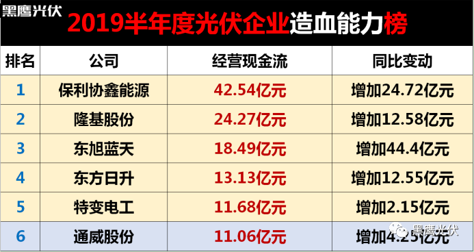 很多企业都在提升自身造血能力(经营现金流),数据显示,2019年上半年62家光伏公司经营现金流净额合计为163.48亿元,同比增长了224.43%。