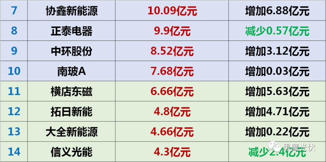 (1) 光伏上市公司合计实现营业收入2086.08亿元,同比增长2.69%;(2) 截至2019年6月末,光伏上市公司预收款规模合计为239.99亿元,同比增长 18.06%;(3) 光伏上市公司筹资现金流净额为203.74亿元,同比增长157.74%;(4) 光伏上市公司经营现金流净额合计为163.48亿元,同比增长224.43%;(5) 截至6月末光伏上市公司拥有的货币资金储备合计为1306.07亿元,同比增长8.60%;(6) 截至6月末光伏上市公司整体固定资产净值合计已经达到4355.91亿元,同比增长9.43%;当然,压力并不小:上半年光伏上市公司合计实现净利润124.39亿元,同比下降了18.13%;对外投资现金流为494.12亿元,同比减少了229.29亿元,降幅为46.40%。实际上,黑鹰光伏团队进一步分析数据发现,光伏行业整体可能比上述数据所展现的要严峻的多,某些看似复苏或强劲增长的数据背后,更多是来自于头部企业的强力支撑而已,中小企业所面临的困境和压力不言而喻。(1) 榜单前十名光伏上市公司实现净利润99.94亿元,占整体比重达80.34%;(2) 榜单前十名企业预收款规模合计为175.6亿元,占整体比重达73.17%; (3) 榜单前十名企业筹资现金流净额合计为233.55亿元,占整体比重达114.63%;(4) 榜单前十名企业经营现金流净额合计为157.36亿元,占整体比重达96.26%;(5) 榜单前十名企业对外投资现金流流出合计为282.41亿元,占整体比重达57.16%; (6 ) 榜单前十名企业货币资金规模合计为782.75亿元,占整体比重达59.93%。![]()