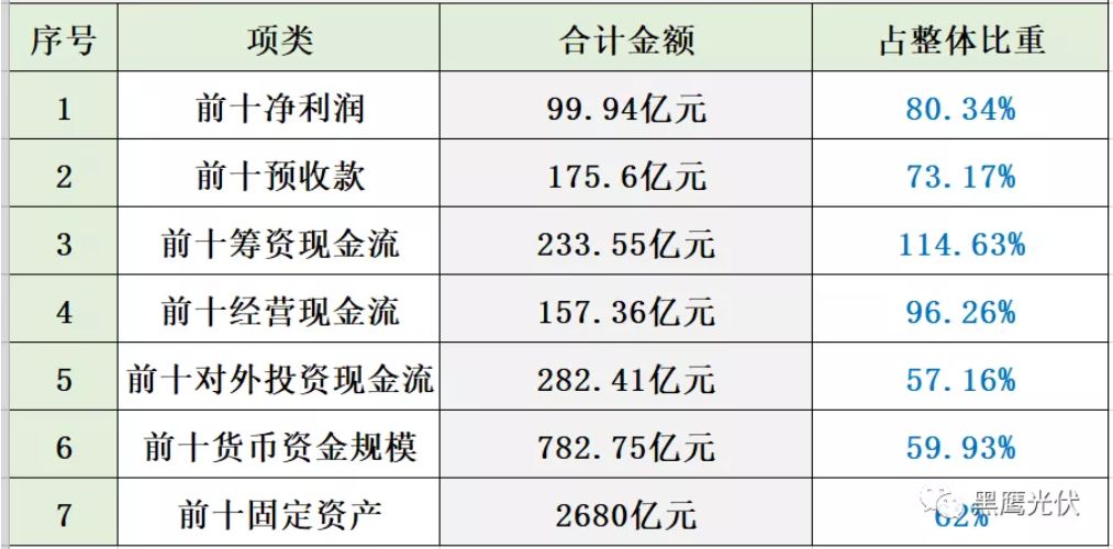 此外,我们曾经从营收、净利润、研发投入、总资产等近二十个维度研究光伏上市企业,从多个维度统计可以发现,531后一年多时间,洗牌与调整之下,光伏产业经营分化愈发明显。比如,在2019年上半年,69家光伏上市企业中, 榜单前十名企业的净利润超过整体比重的80.34%,预收款规模占整体比重超过73%,筹资现金流净额占整体比重超过110%,对外投资现金流流出占整体比重超过一半。