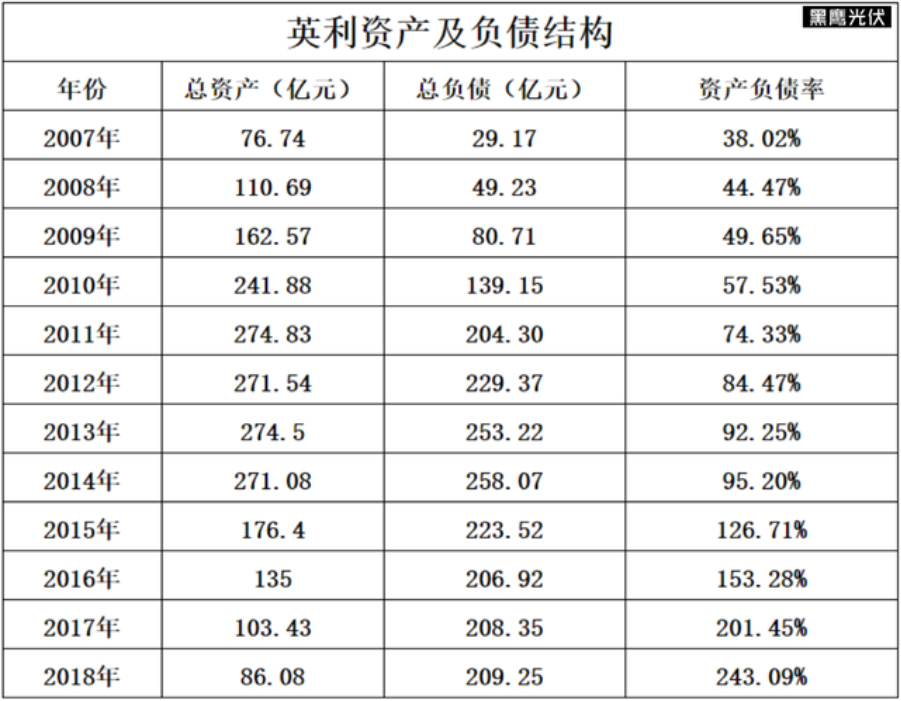 赛维破产重组前后,英利也已处在从债务危机到破产重组的十字路口:截至2015年年底的总资产为189.77亿元,负债总额为192.67亿元;而截至2016年6月底,英利的负债率已经攀升至128%,处于严重资不抵债状态。
