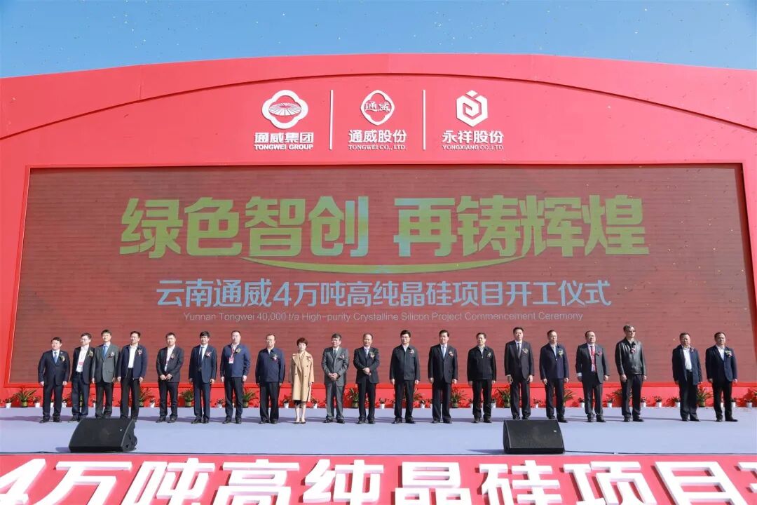 11月12日,云南通威4万吨高纯晶硅项目开工仪式在云南省保山市工贸园区昌宁“园中园”隆重举行。云南省人民政府副省长董华,省政府副秘书长黄小荣,省工信厅厅长洪正华、副厅长保建彬,省科技厅副厅长阮朝奇,省能源局副局长童书玮,云南电网公司二级巡视员杨波,中国有色金属工业协会副会长、硅业分会会长赵家生,中共保山市委书记赵德光,市委副书记、市长杨军,市政协主席董礼书,市人大常委会副主任邹银凯,副市长杨东伟,市政协副主席、昌宁县委书记苏格非,华陆工程科技党委副书记、总经理康建斌,江苏环太集团董事长王禄宝,弘元新材料(包头)有限公司董事长杨建良,中圣集团副董事长、执行董事马明,特变电工总裁黄汉杰,天合光能常务副总裁曹博,隆基股份供应链管理中心总经理蒋东宇,中环股份副总经理张长旭,民生银行成都分行行长助理马元乐,华融金融租赁总经理助理孙平,华信众恒咨询执行董事杨荣凤,北京京运通总裁佟兴雪等领导嘉宾出席。十一届全国政协常委、全国人大代表、全国工商联新能源商会执行会长、通威集团董事局刘汉元主席,集团禚玉娇总裁,集团副总裁黄其刚,通威股份董事、永祥股份董事长兼总经理段雍,永祥股份副总经理兼云南通威高纯晶硅总经理杜炳胜等出席开工仪式。