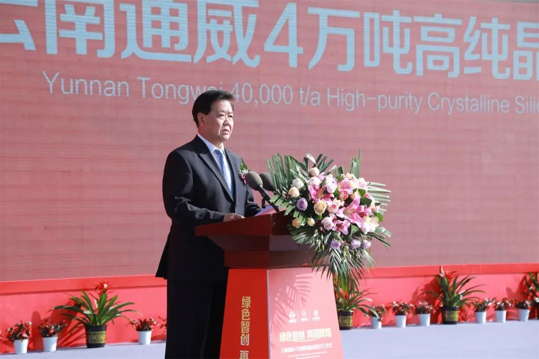 中国有色金属工业协会副会长、硅业分会会长赵家生在致辞中指出,能源安全、清洁化转型将是“十四五”期间我国重要的能源战略。目前,国内晶硅光伏产业在国际市场具备很强的竞争力。尤其是在晶硅光伏产业四大制造环节中,成本、技术及规模化等方面在全球均具备突出的综合竞争优势,可有效对能源保障提供支持。可以预期,光伏发电将在“十四五”期间迎来更大发展。通威是我国晶硅光伏产业非常重要的骨干企业,其生产规模、工艺技术、生产成本和产品质量等各方面都具有显著竞争优势。此次云南通威高纯晶硅项目开工是我国“十四五”期间硅产业的第一个重点项目,期待项目早日建成,为我国硅产业的绿色发展再创新辉煌。