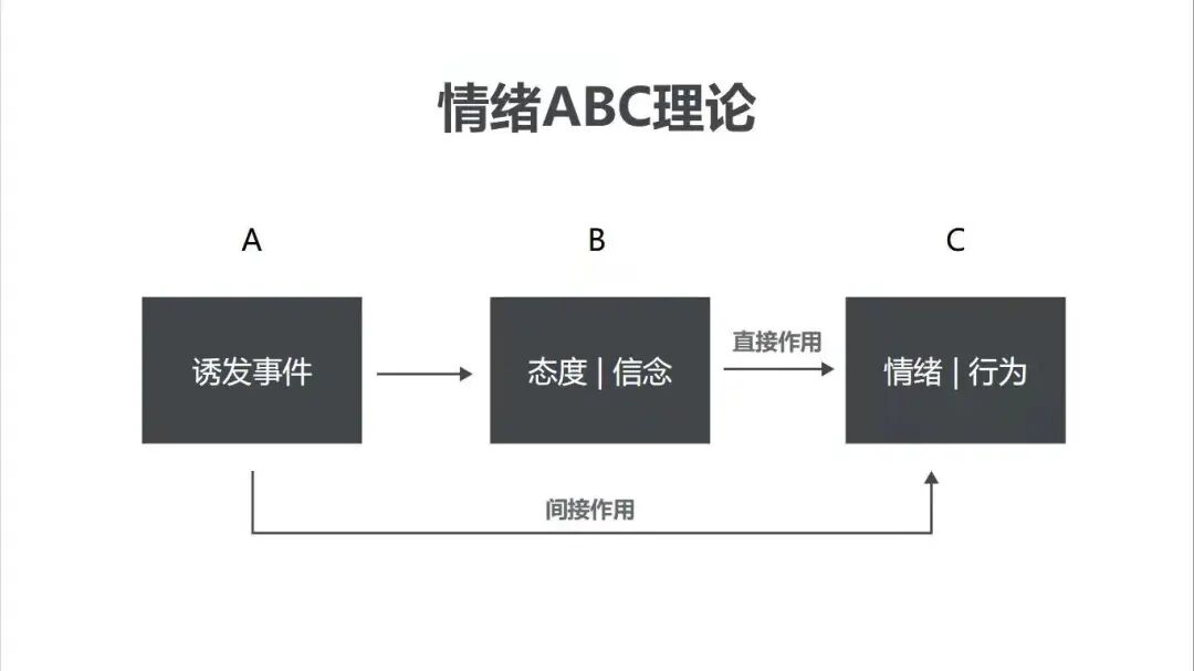 最后,运用ABC理论调节失控情绪。美国心理学家埃利斯认为,正是由于人们常有的一些不合理的信念才使我们产生情绪困扰。其中,A(Activating event)为刺激事件, B(Belief)是个体对 A 的观念观点,C(Consequence)是A事件造成的情绪结果。产生情绪结果(C)的直接原因不是事件(A),而是个体对 A 的信念(B)。如果信念理性,则会出现积极的情绪效果;如果信念非理性,则会出现消极情绪和行为障碍。而日常生活中主要有三种不合理的信念(B):绝对化的要求、过分概括的评价、以及糟糕至极的结果。如我“必须”成功,专业科目“总是”学不会,手机只有20%电量 “太糟糕”,当日常生活中情绪失控时,我们可以想想自己的大脑是否存在这些“绝对化”“概括化”和“灾难化”等不合理的想法,如果有,就要有意识地“用合理观念”取而代之。那么怎么运用情绪ABC理论呢?