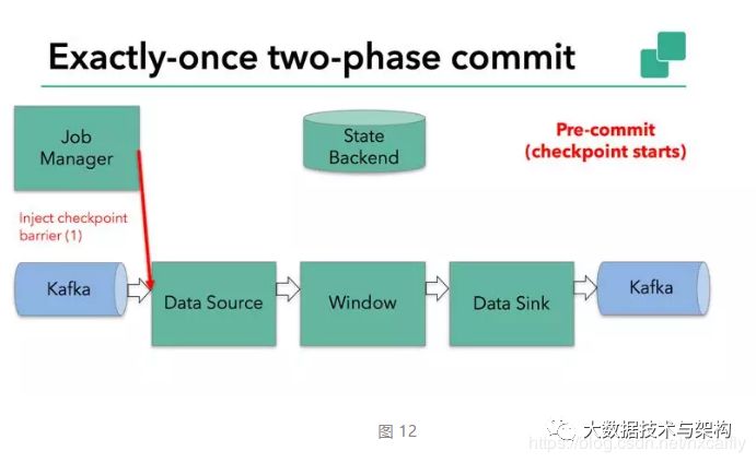 如图 12 所示,Flink checkpointing 开始时便进入到 pre-commit 阶段。具体来说,一旦 checkpoint 开始,Flink 的 JobManager 向输入流中写入一个 checkpoint barrier ,将流中所有消息分割成属于本次 checkpoint 的消息以及属于下次 checkpoint 的,barrier 也会在操作算子间流转。对于每个 operator 来说,该 barrier 会触发 operator 状态后端为该 operator 状态打快照。data source 保存了 Kafka 的 offset,之后把 checkpoint barrier 传递到后续的 operator。
