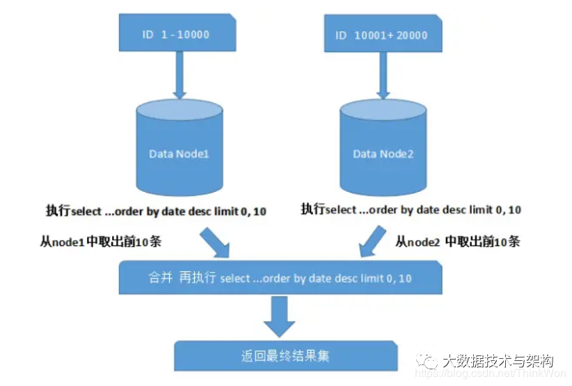 般来讲,分页时需要按照指定字段进行排序。当排序字段就是分片字段的时候,我们通过分片规则可以比较容易定位到指定的分片,而当排序字段非分片字段的时候,情况就会变得比较复杂了。为了最终结果的准确性,我们需要在不同的分片节点中将数据进行排序并返回,并将不同分片返回的结果集进行汇总和再次排序,最后再返回给用户。如下图所示:
