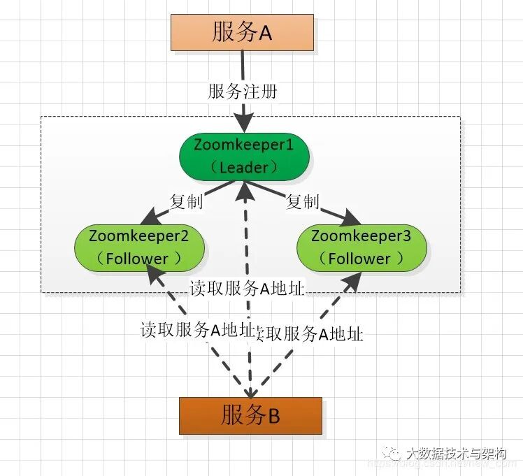 zookeeper服务注册与发现中心集,在集群中,包含一个Leader节点,其余全部为Follower 节点。Leader节点负责读和写操作,Follower 节点只负责读操作。当客户端向集群发出写请求时,写请求会转发到Leader节点,Leader写操作完成后,采用广播的形式,向其余Follower 节点复制数据,Follower节点也写成功,返回给客户端成功。流程如图: