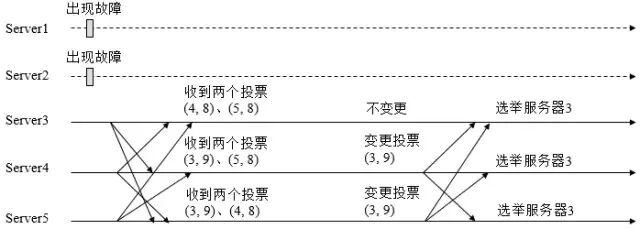 假定zk由5台机器组成,SID分别为1、2、3、4、5,ZXID分别为9、9、9、8、8,并且此时SID为2的机器是Leader机器,某一时刻,1、2所在机器出现故障,因此集群开始进行Leader选举。在第一次投票时,每台机器都会将自己作为投票对象,于是SID为3、4、5的机器投票情况分别为(3, 9),(4, 8), (5, 8)