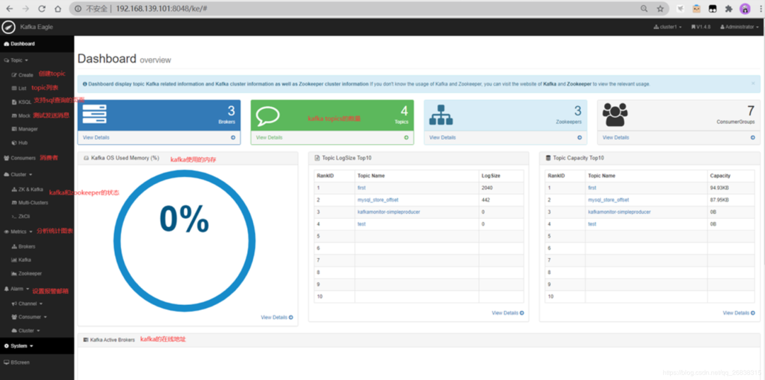 cd /opt/module/kafka-eagle-bin-1.4.8/kafka-eagle-web-1.4.8# 修改为以下内容#设置kafka集群(可以多个)kafka.eagle.zk.cluster.alias=cluster1cluster1.zk.list=cm1:2181,cm2:2181,cm3:2181####################################### kafka eagle 的端口######################################kafka.eagle.webui.port=8048####################################### kafka jdbc 地址注意可以自己安装数据mysql也可以自带的######################################kafka.eagle.driver=org.sqlite.JDBCkafka.eagle.url=jdbc:sqlite:/opt/module/kafka-eagle-bin-1.4.8/kafka-eagle-web-1.4.8/db/ke.dbkafka.eagle.username=rootkafka.eagle.password=123456