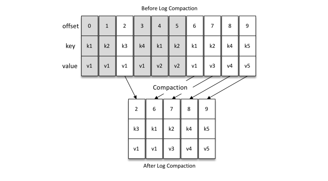 日志压缩(Log Compaction):针对每个消息的 key 进行整合,对于有相同 key 的不同 value 值,只保留最后一个版本。