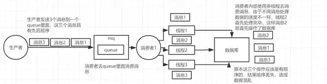 ①一个queue,有多个consumer去消费,这样就会造成顺序的错误,consumer从MQ里面读取数据是有序的,但是每个consumer的执行时间是不固定的,无法保证先读到消息的consumer一定先完成操作,这样就会出现消息并没有按照顺序执行,造成数据顺序错误。