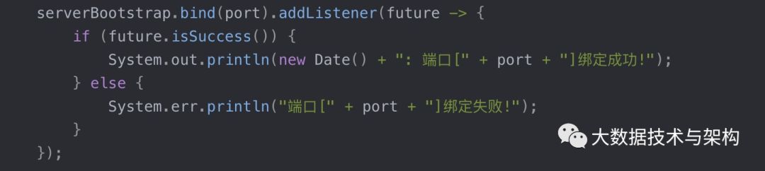 例如下面的的代码中绑定端口是异步操作,当绑定操作处理完,将会调用相应的监听器处理逻辑相比传统阻塞I/O,执行I/O操作后线程会被阻塞住, 直到操作完成;异步处理的好处是不会造成线程阻塞,线程在I/O操作期间可以执行别的程序,在高并发情形下会更稳定和更高的吞吐量。