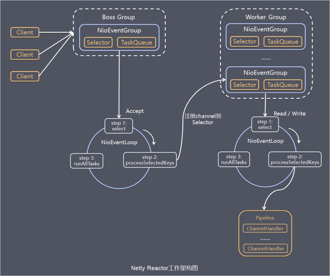 特别说明的是:虽然Netty的线程模型基于主从Reactor多线程,借用了MainReactor和SubReactor的结构,但是实际实现上,SubReactor和Worker线程在同一个线程池中:上面代码中的bossGroup 和workerGroup是Bootstrap构造方法中传入的两个对象,这两个group均是线程池异步处理