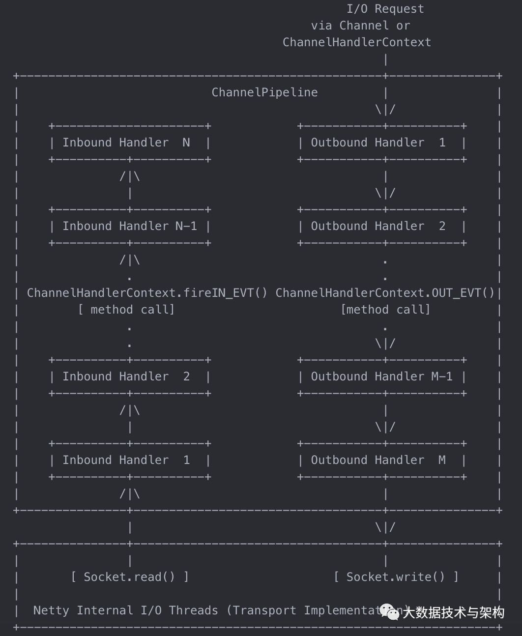 一个 Channel 包含了一个 ChannelPipeline, 而 ChannelPipeline 中又维护了一个由 ChannelHandlerContext 组成的双向链表, 并且每个 ChannelHandlerContext 中又关联着一个 ChannelHandler。入站事件和出站事件在一个双向链表中,入站事件会从链表head往后传递到最后一个入站的handler,出站事件会从链表tail往前传递到最前一个出站的handler,两种类型的handler互不干扰。工作原理架构