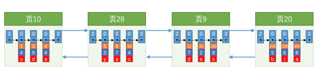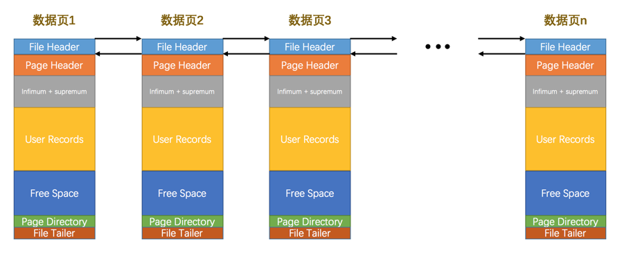 FIL_PAGE_PREV和FIL_PAGE_NEXT就分别代表本页的上一个和下一个页的页号。这样通过建立一个双向链表把许许多多的页就都串联起来了