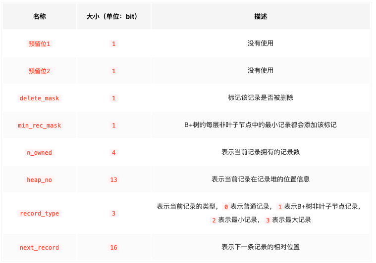 这个属性表示当前记录的类型,一共有4种类型的记录,0表示普通记录,1表示B+树非叶节点记录,2表示最小记录,3表示最大记录。