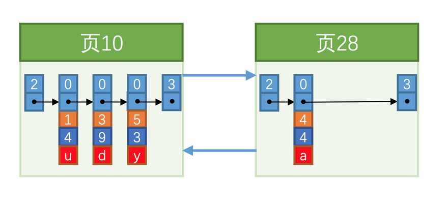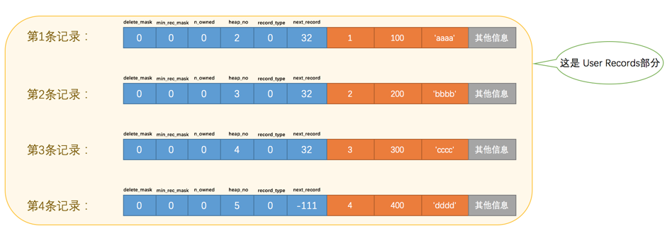 从图中可以看出来,我们的记录按照主键从小到大的顺序形成了一个单链表。