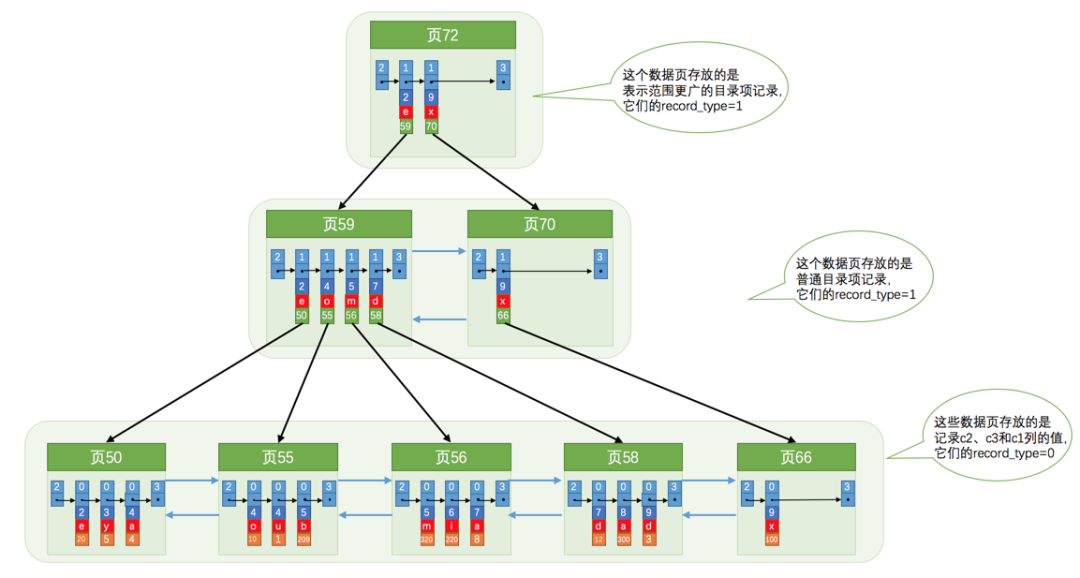 内节点中存储的是目录项记录,叶子节点中存储的是用户记录(由于不是聚簇索引,所以用户记录是不完整的,缺少country列的值)。