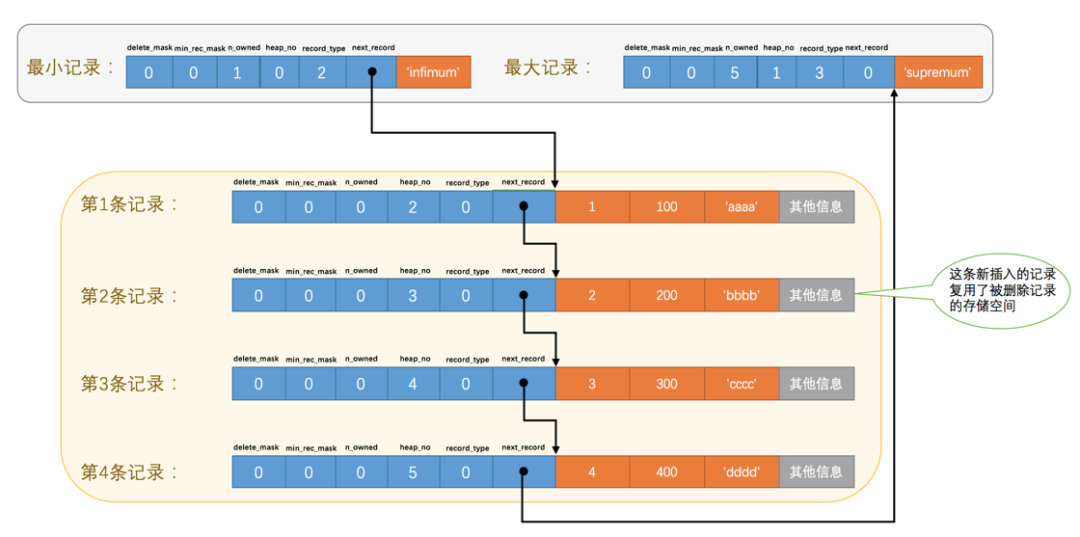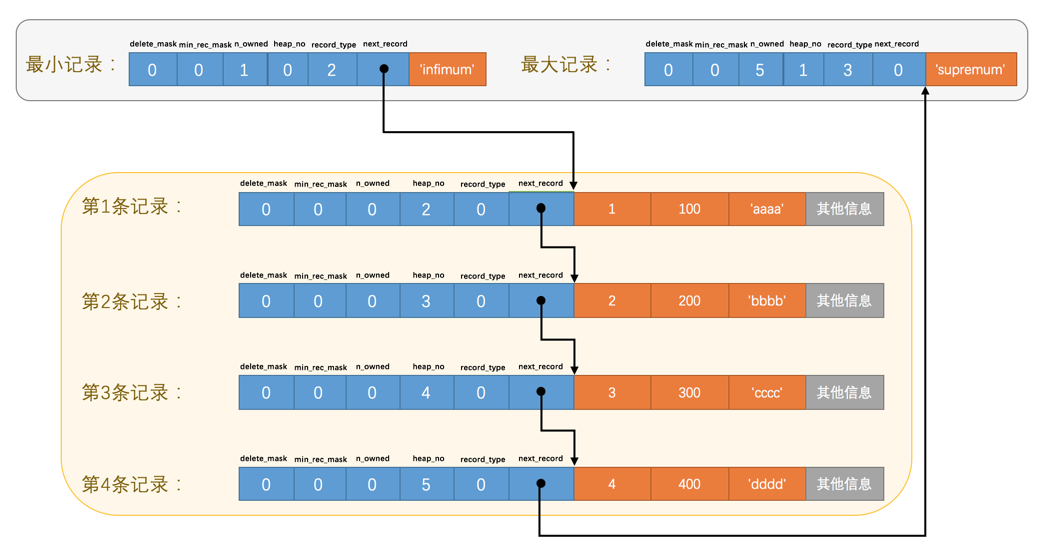 下一条记录指得并不是按照我们插入顺序的下一条记录,而是按照主键值由小到大的顺序的下一条记录。而且规定 Infimum记录(也就是最小记录) 的下一条记录就是本页中主键值最小的用户记录,而本页中主键值最大的用户记录的下一条记录就是 Supremum记录(也就是最大记录)