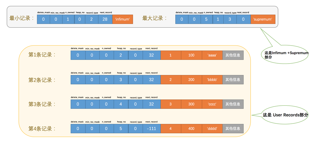 heap_no值为0和1的记录,称为伪记录或者虚拟记录。这两个伪记录一个代表最小记录,一个代表最大记录。