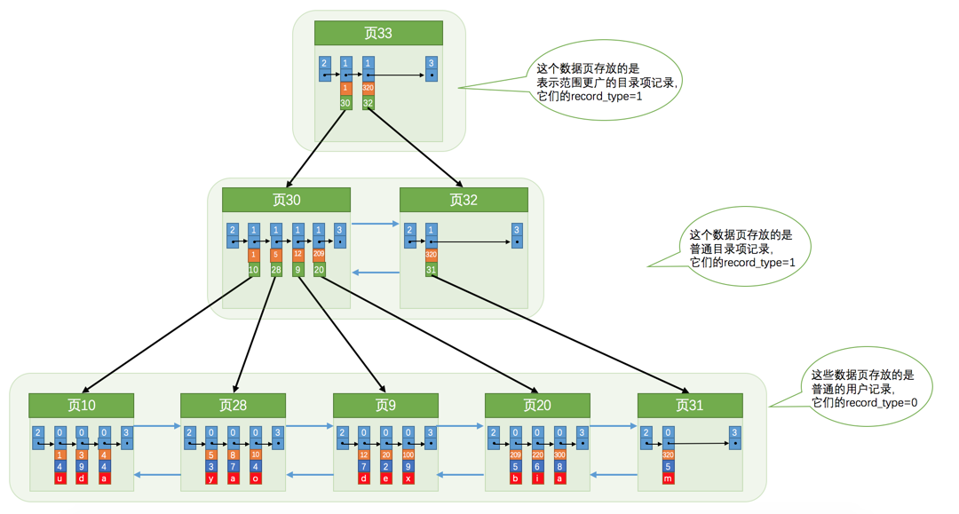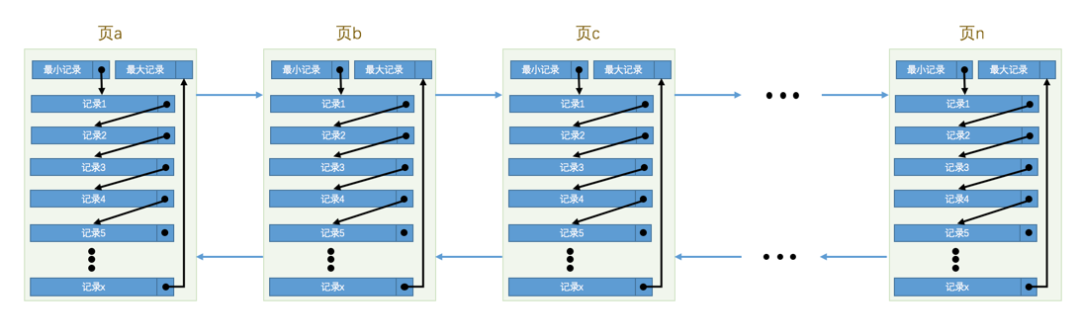由于所有记录都是由链表连起来的(记录之间用单链表,数据页之间用双链表),所以他们之间的记录都可以很容易的取出来喽~
