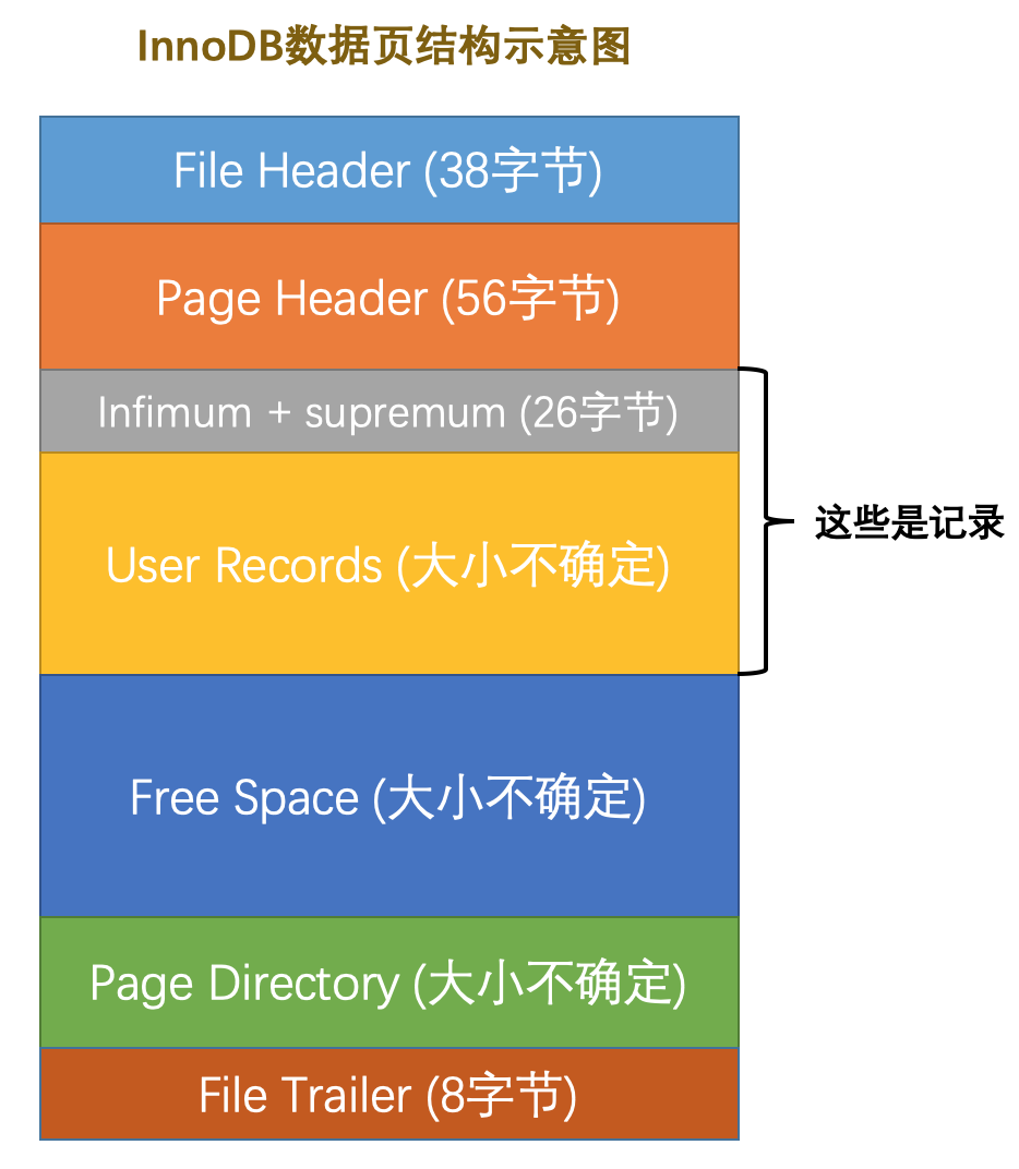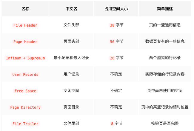 数据页代表的这块16KB大小的存储空间可以被划分为多个部分,不同部分有不同的功能,各个部分如图所示: