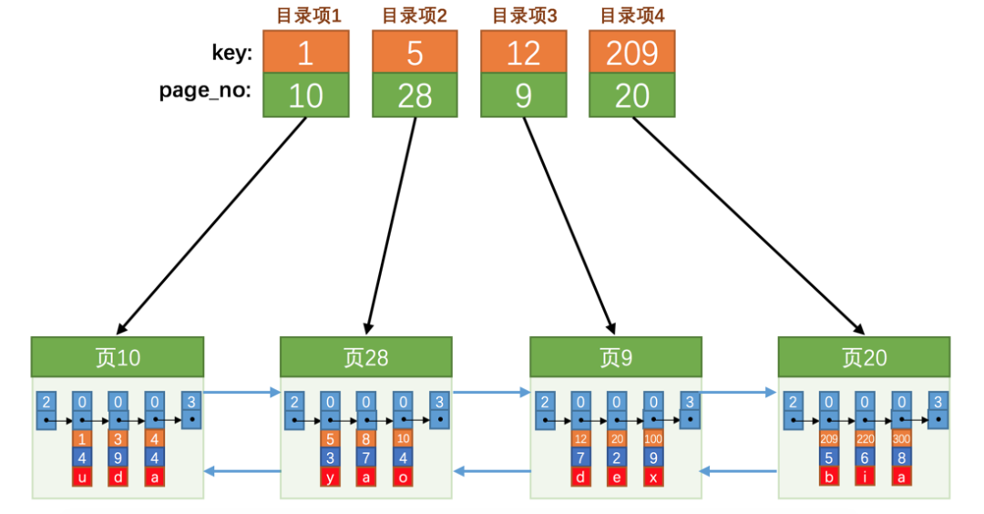 现在我们了解了记录在页中按照主键值由小到大顺序串联成一个单链表,那如果我们想根据主键值查找页中的某条记录该咋办呢?