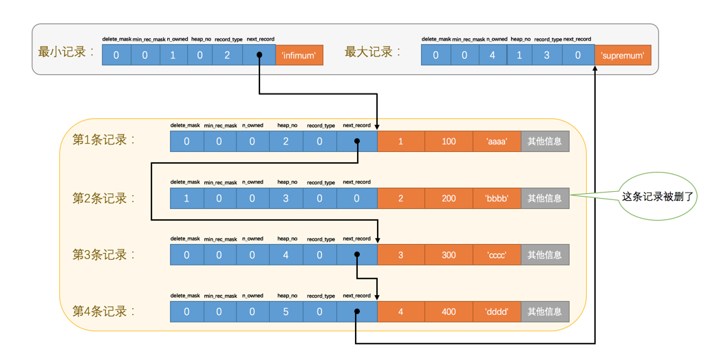 * 第2条记录的next_record值变为了0,意味着该记录没有下一条记录了。
