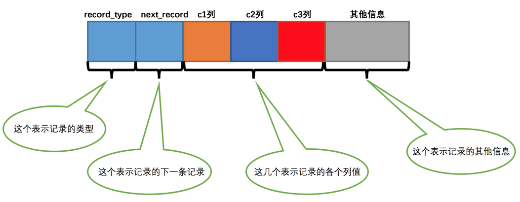 它表示从当前记录的真实数据到下一条记录的真实数据的地址偏移量。比方说第一条记录的next_record值为32,意味着从第一条记录的真实数据的地址处向后找32个字节便是下一条记录的真实数据。