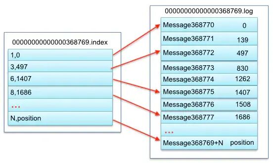 如上图,假设要查询offset=368775的数据,则命中了0000000000000368769这个index,查看到368775在这个index文件中位于第三位(368775 = 368769 + 6,刚好命中这个索引),对应到log文件的物理偏移量是1407。如果没有命中这个索引,则通过上个索引的文件偏移量再顺序查询。