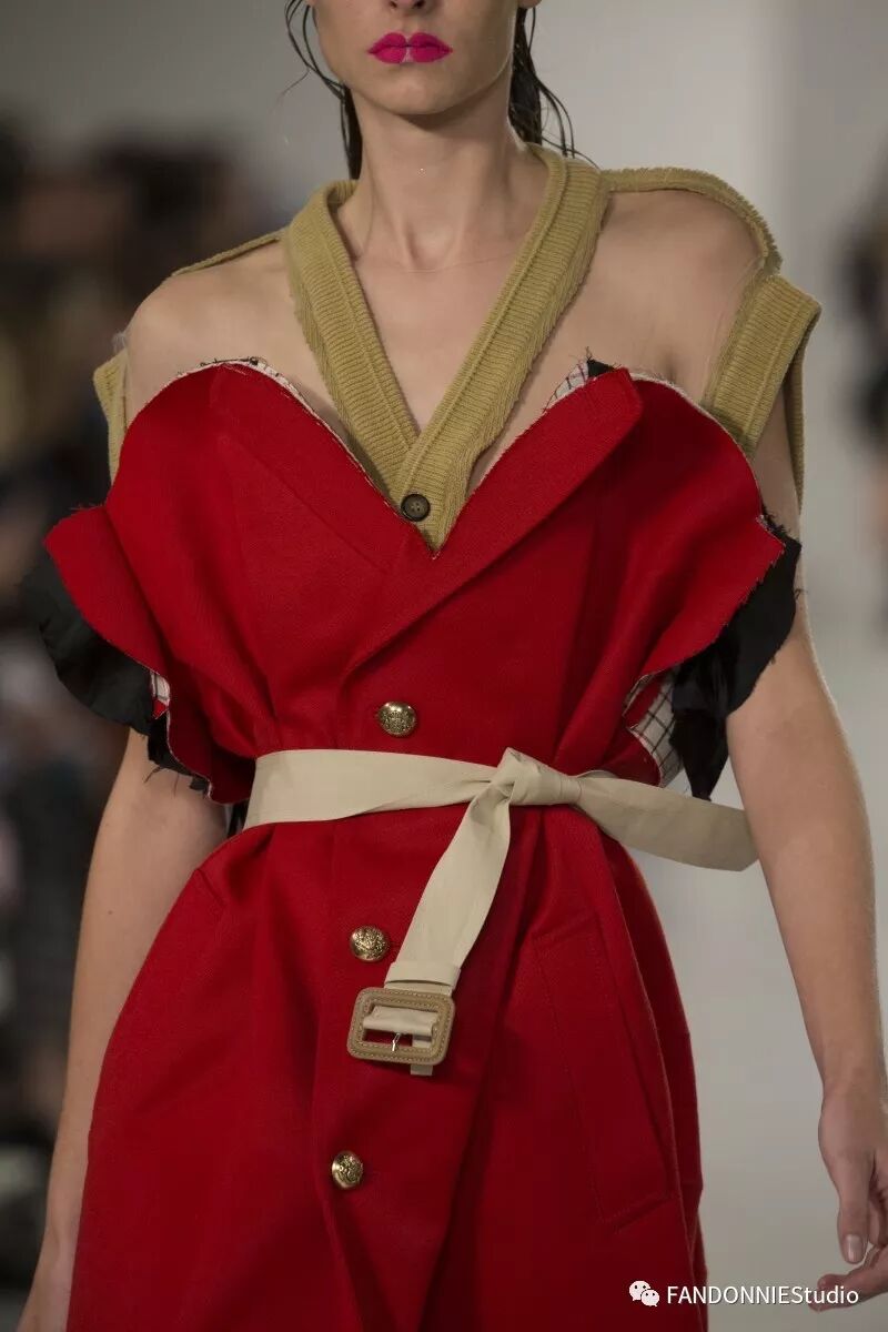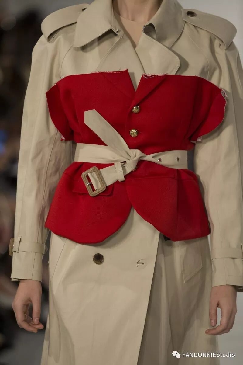 配红色衬里米黄色风衣剪裁而成的连衣裙