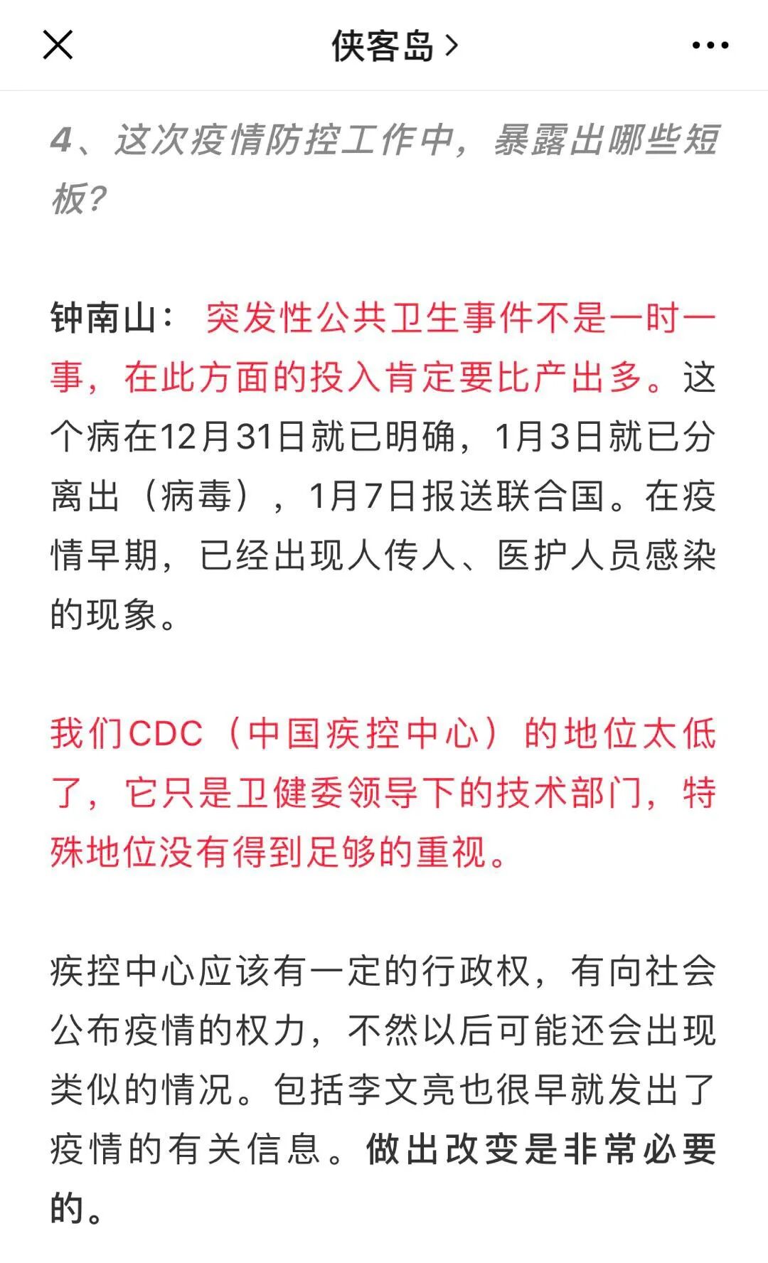本次疫情应对中,暴露出我国公共卫生防治体系的设计中,存在着一些结构性问题。钟南山院士在2020年2月27日的新闻发布会上,也提出我国疾控中心(CDC)的地位过低,缺乏行政权的问题。